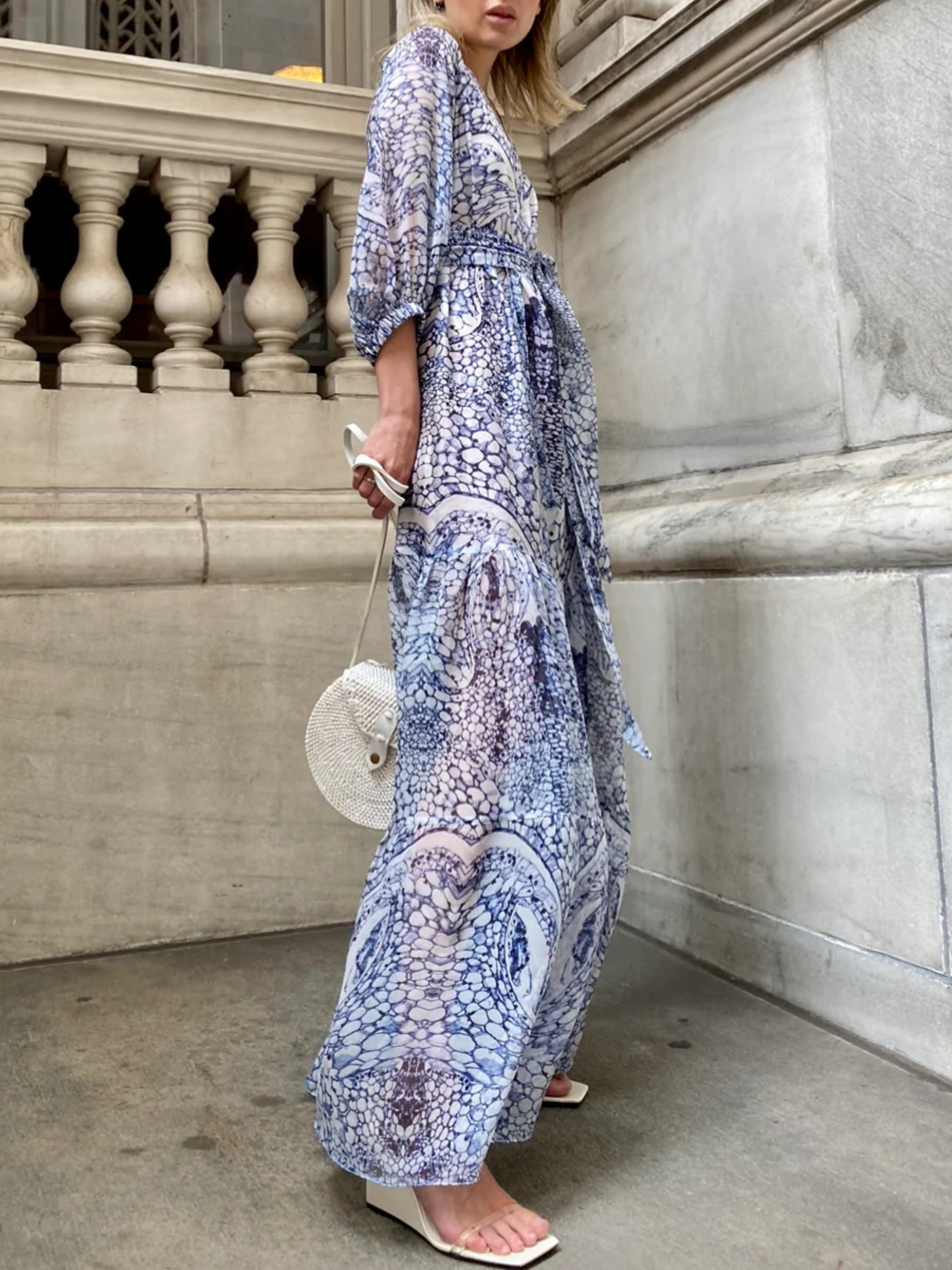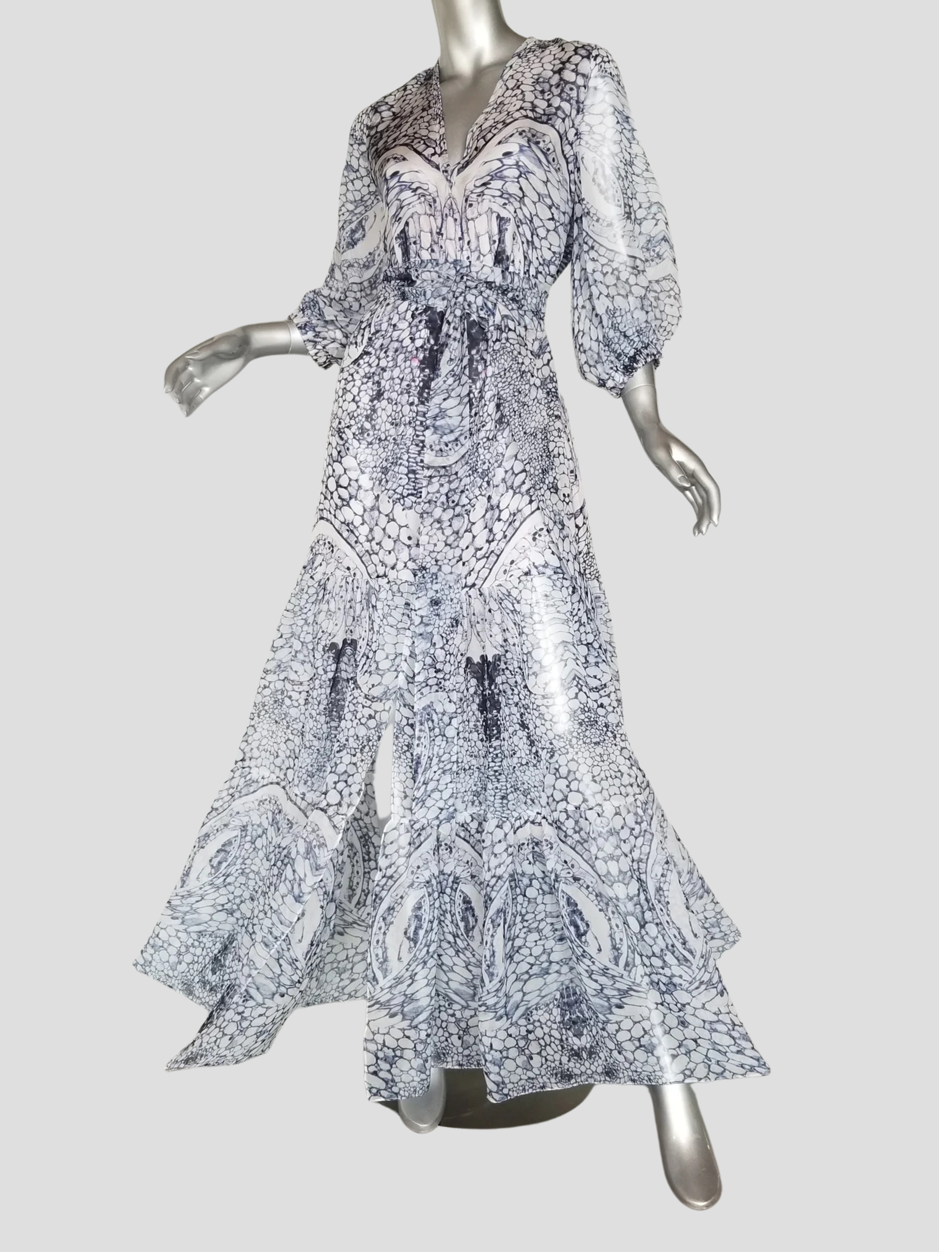 This light as air maxi is made from silk and silk chiffon and is the absolute favorite of the season. The beautiful placement print and light spirit of this dress will enhance the body and make you look and feel beautiful.