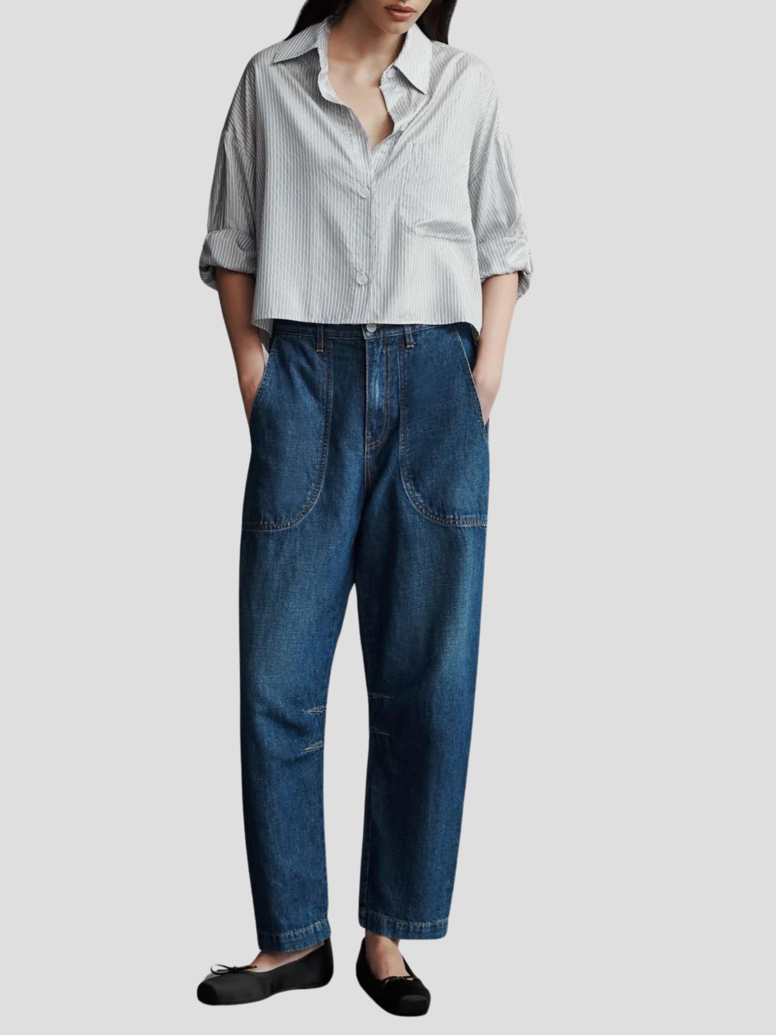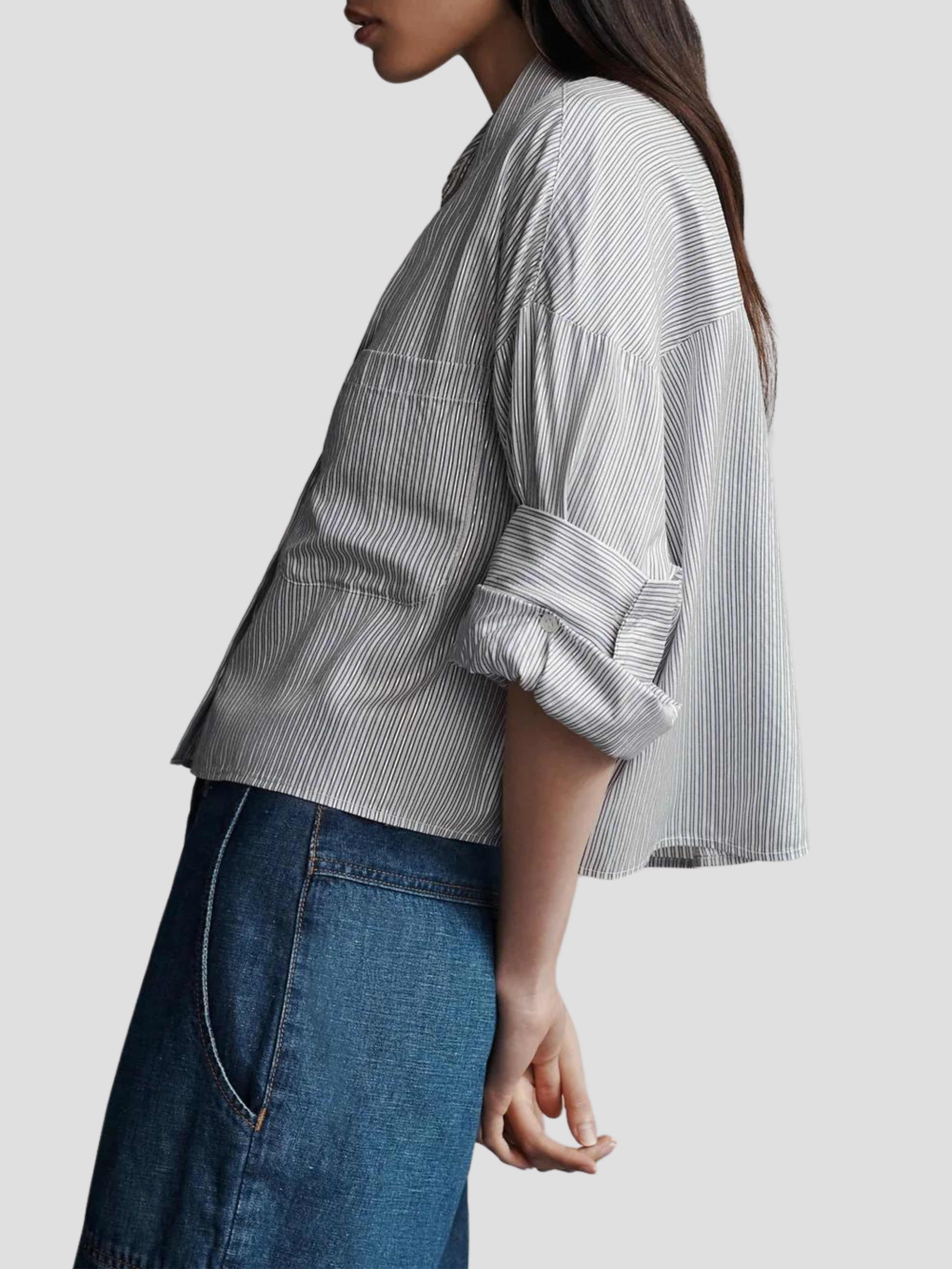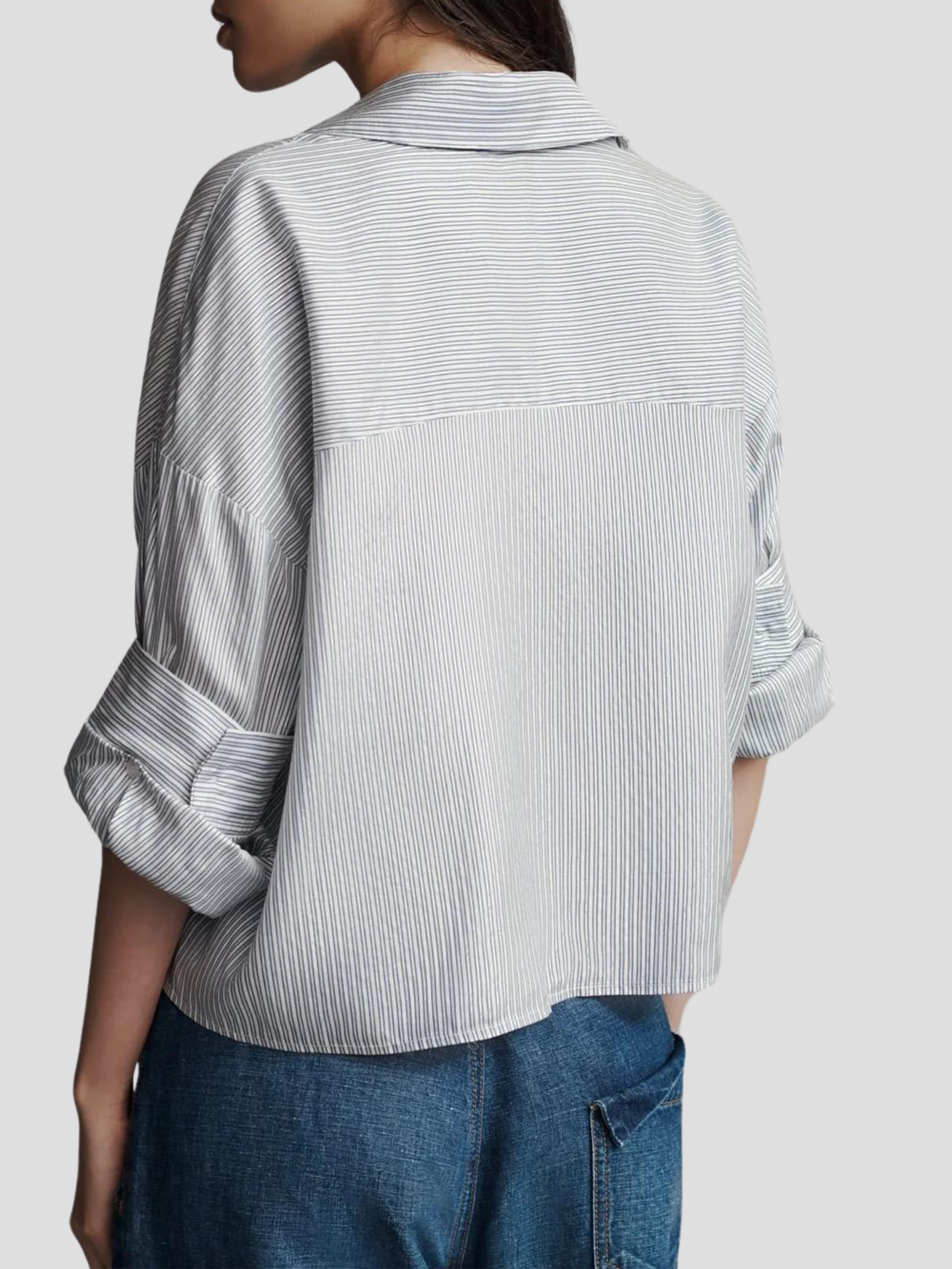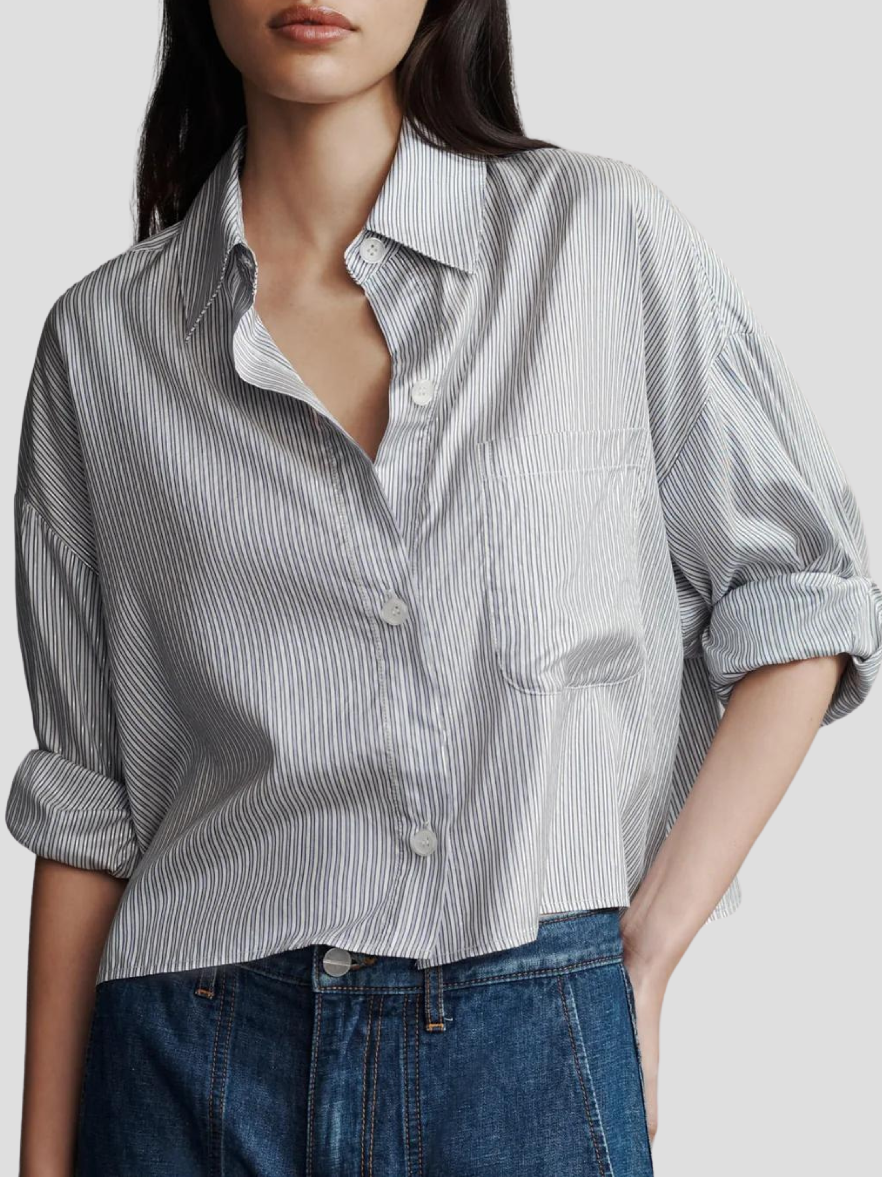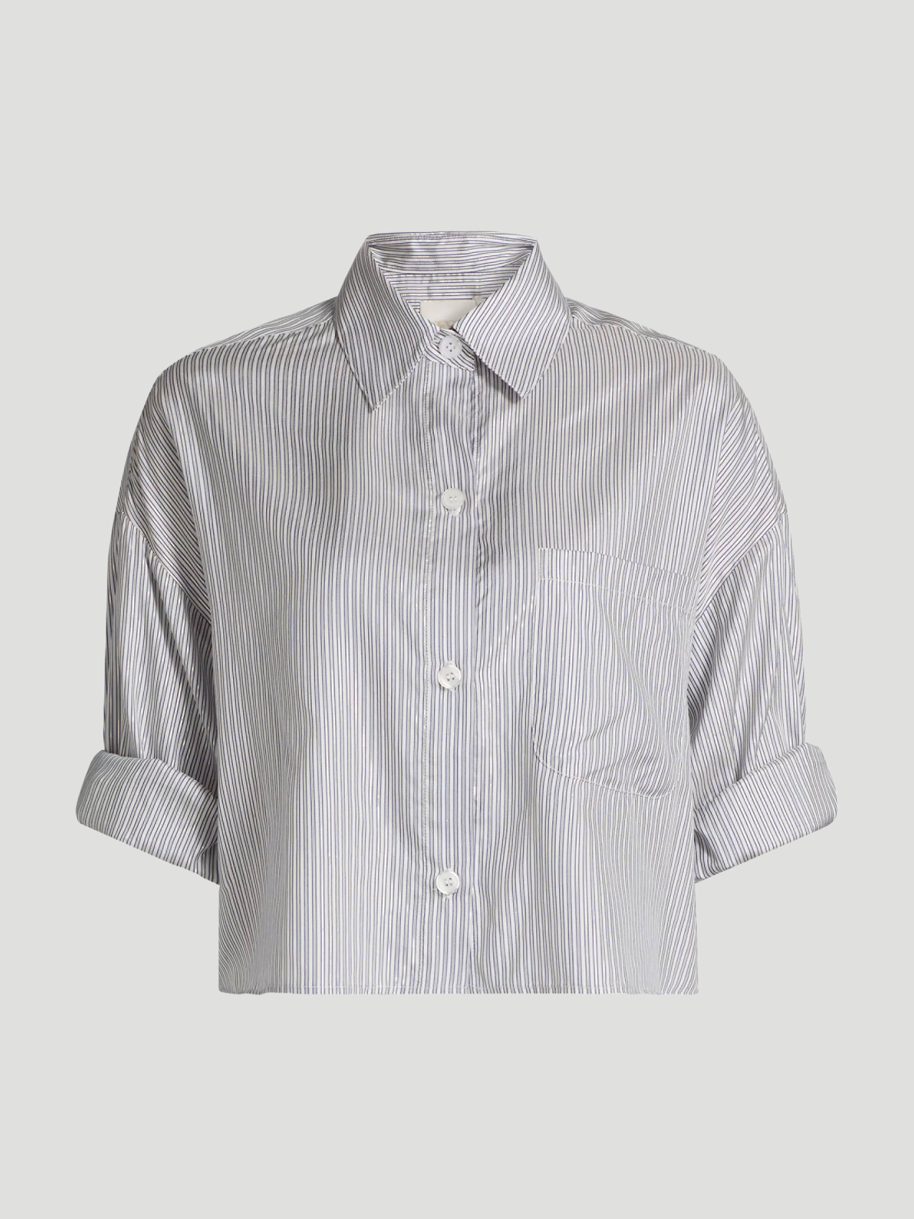 Add a touch of shimmer to your wardrobe with the Next Ex Cropped Shirt in Metallic Stripes from TWP. This cropped, boxy shirt features metallic detailing, drop shoulders, and half sleeves with double roll button cuffs, blending modern style with an understated glam.