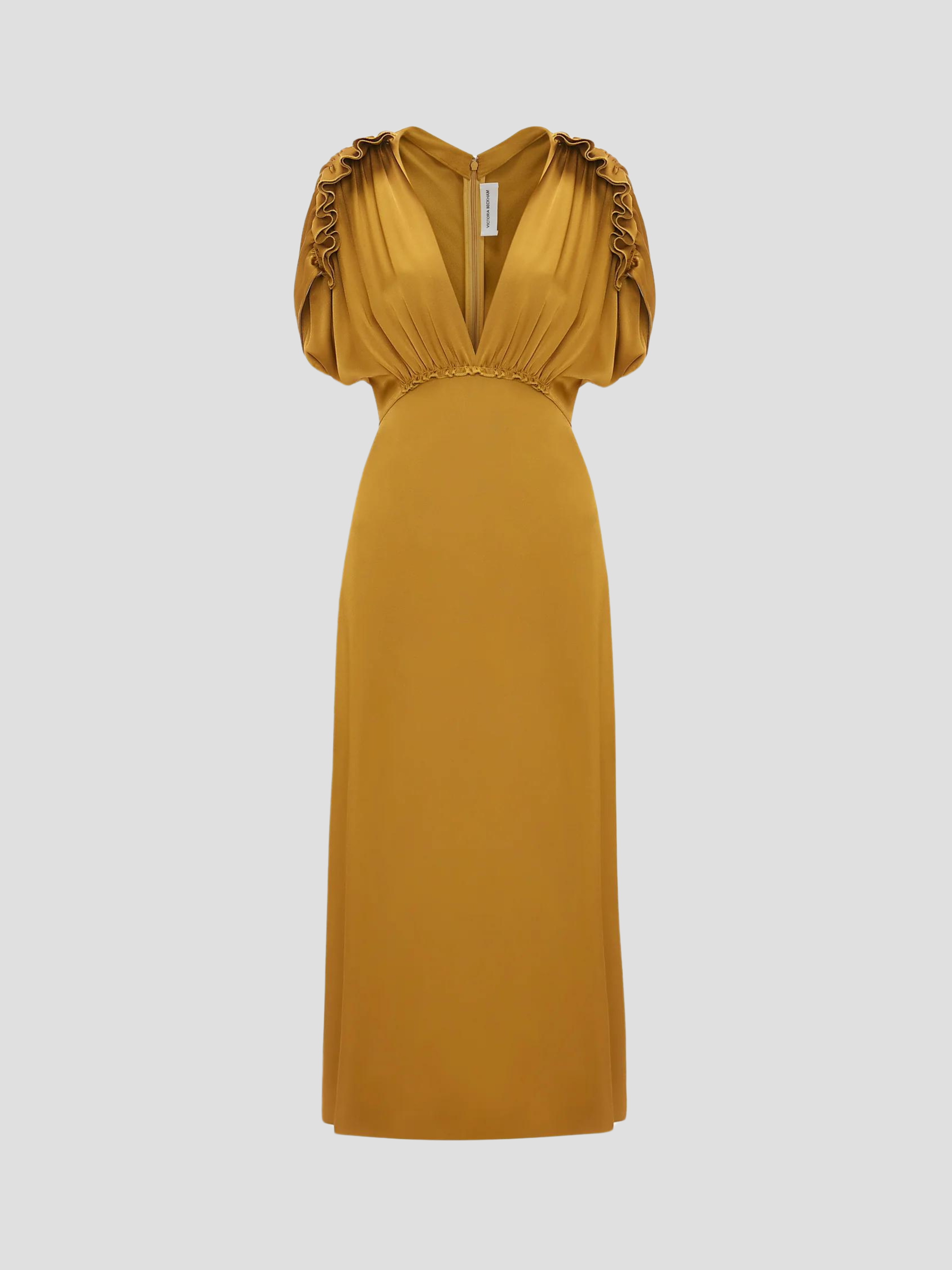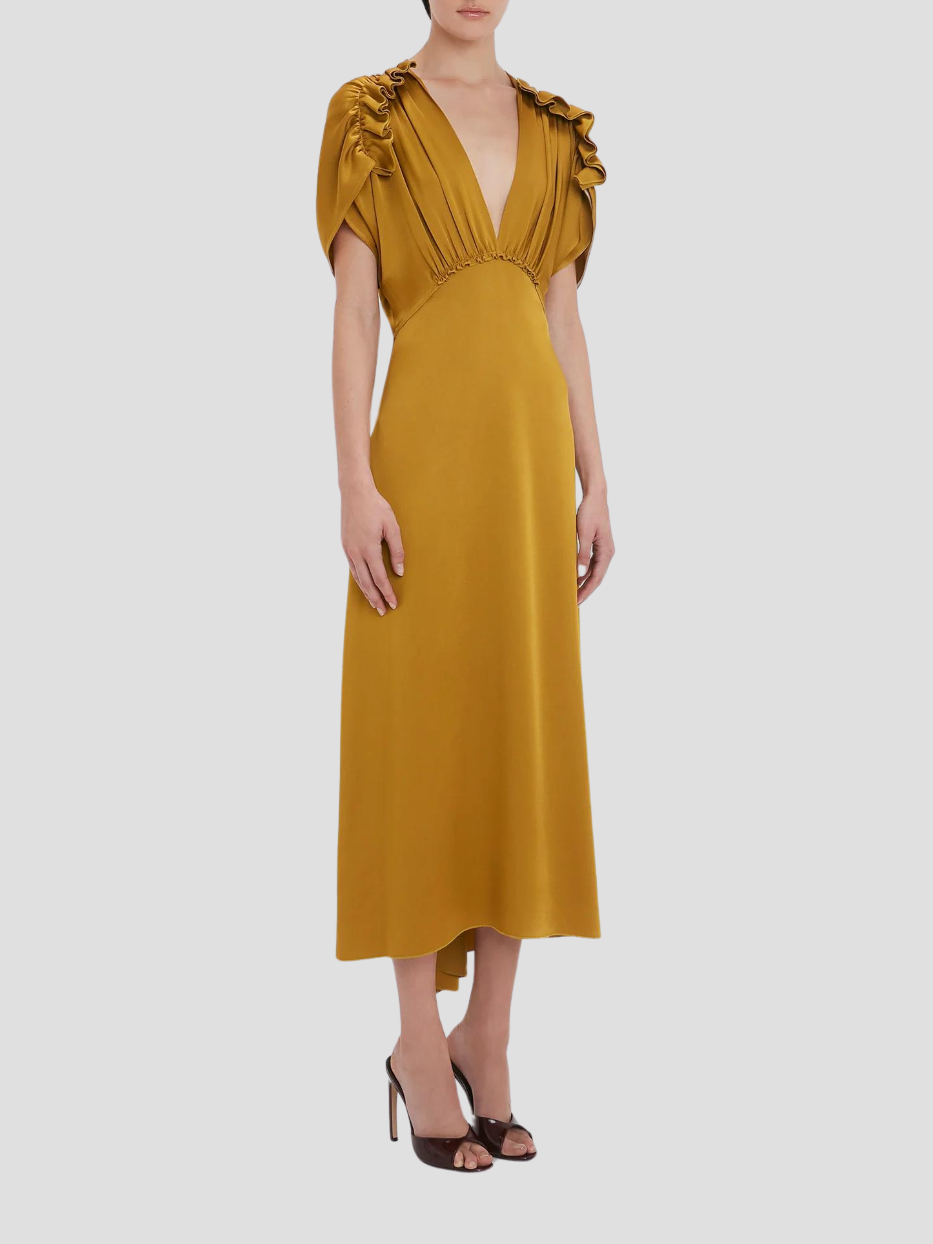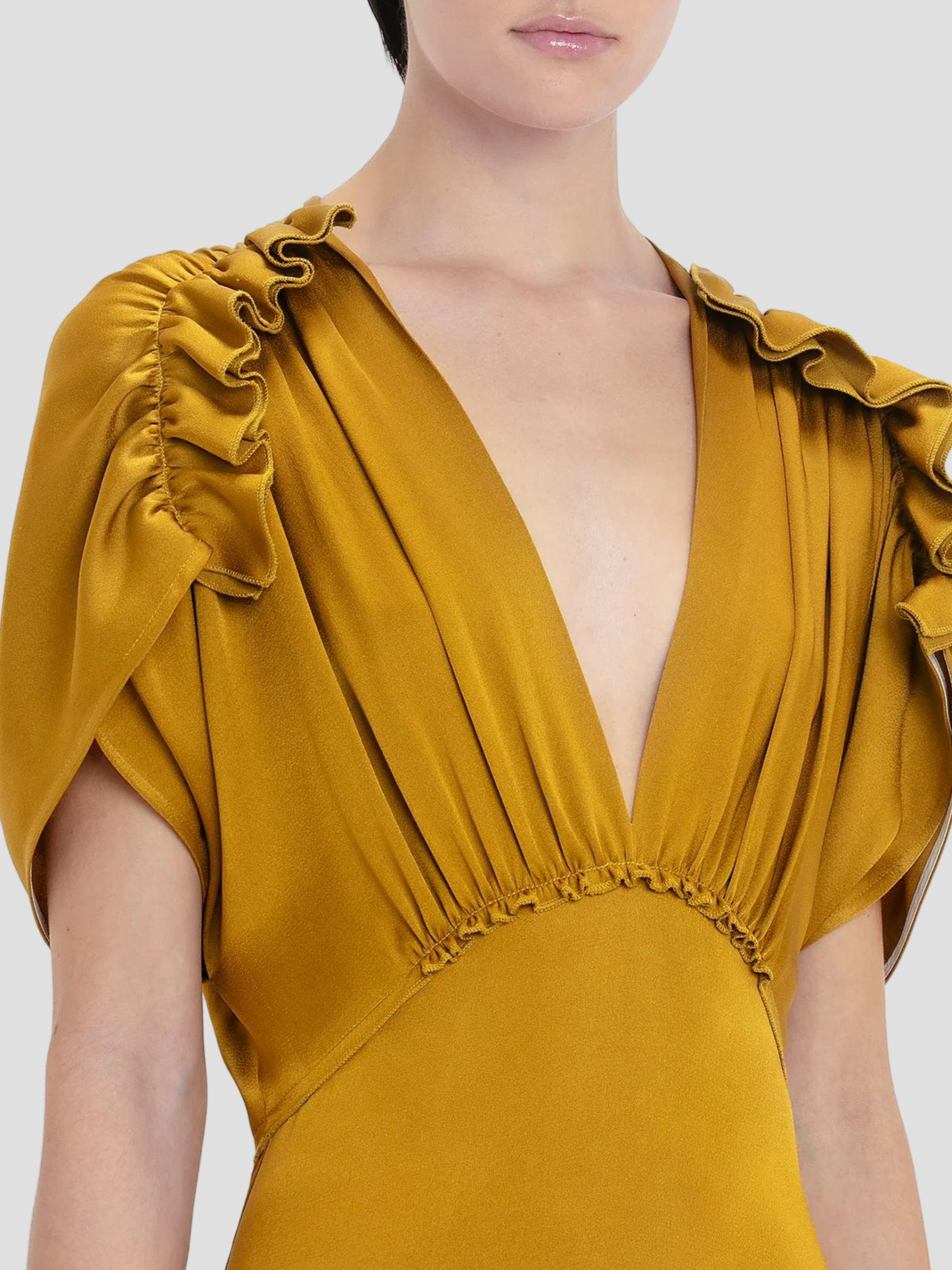 Tactile shoulder frills and gathered detailing at the bust bring a seductive quality to the V-Neck Ruffled Midi Dress. Additional design details include directional exposed seams and a longer-length hemline at the back. Presented in a luscious shade of Harvest Gold for the new season, it has showstopper appeal.