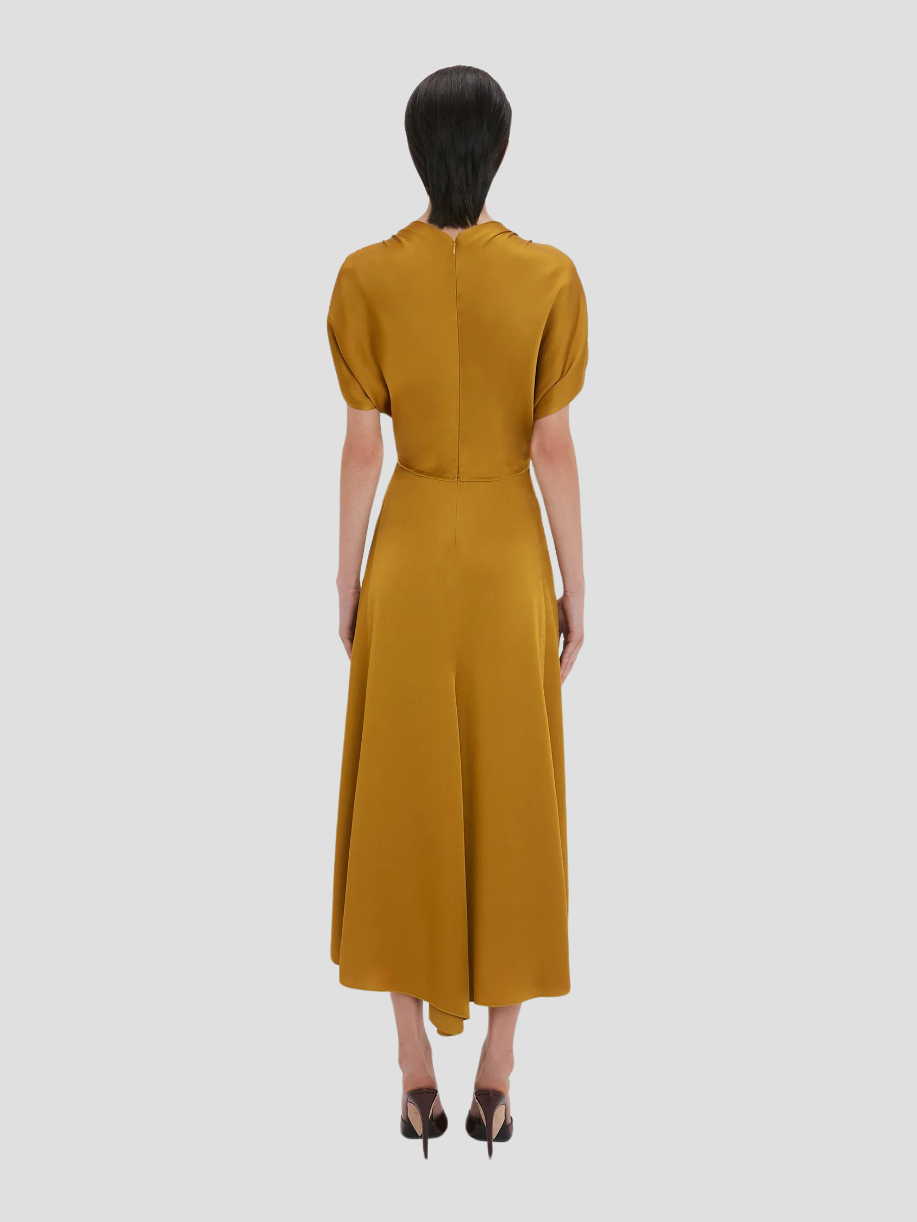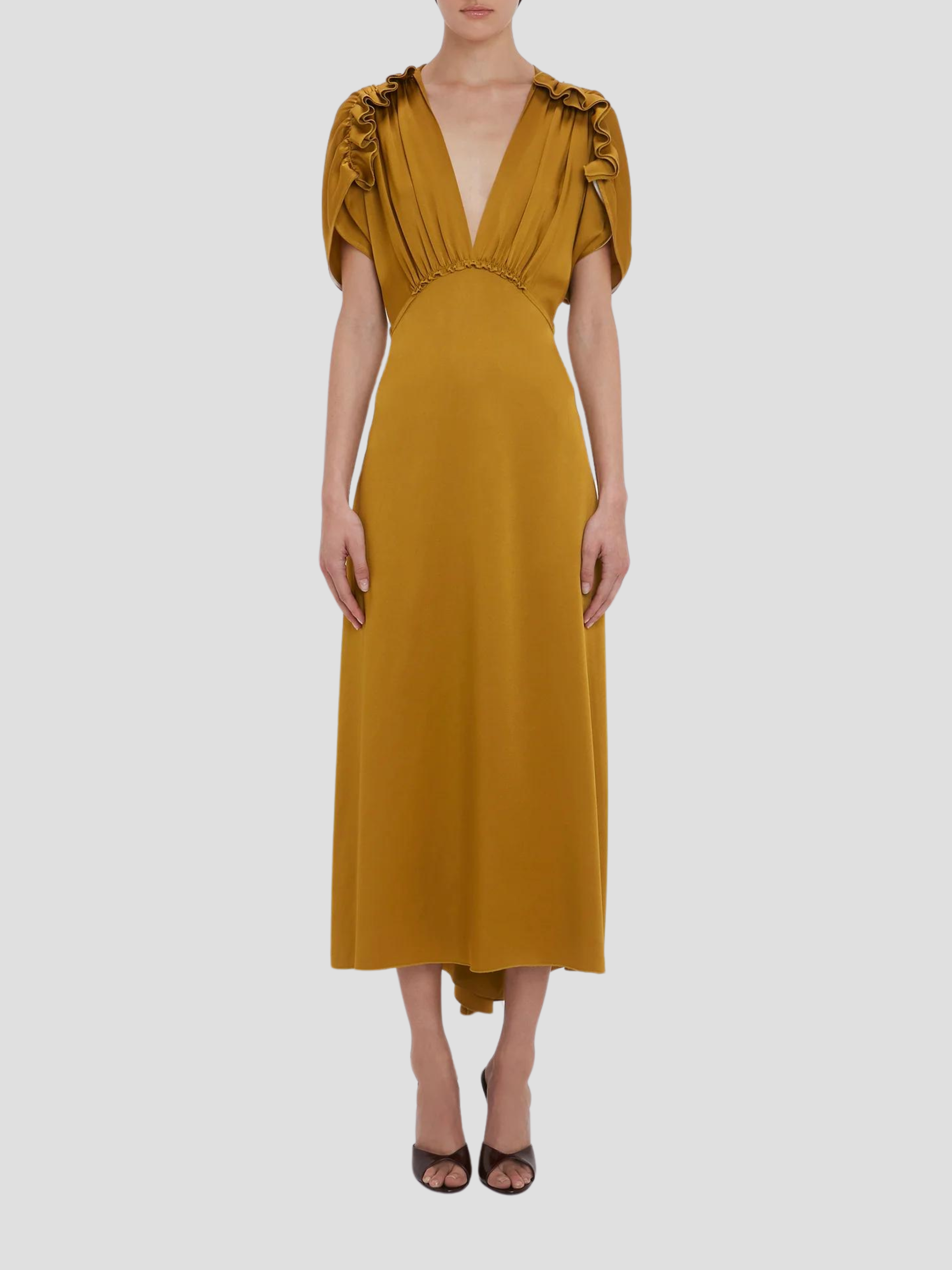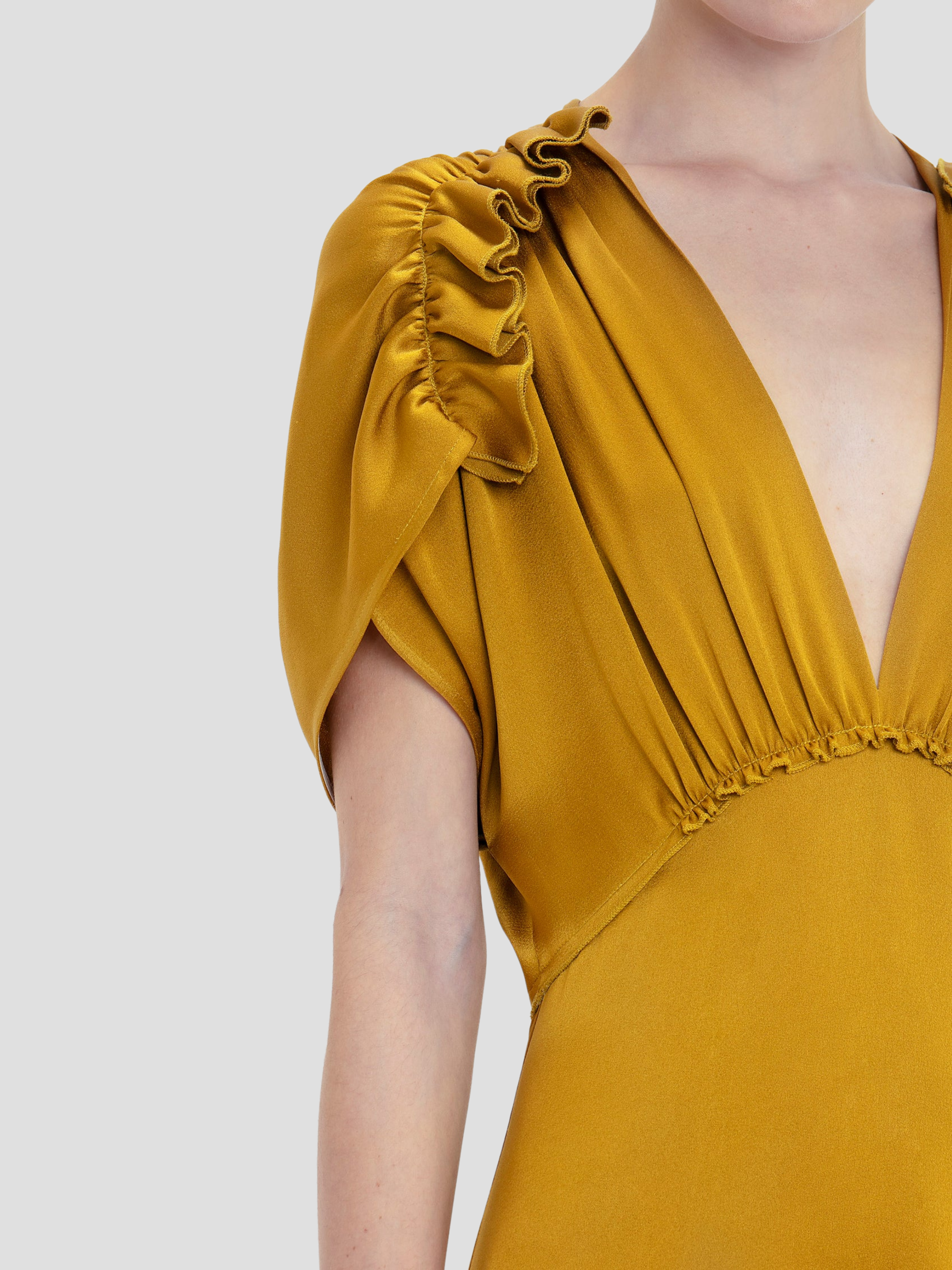 Tactile shoulder frills and gathered detailing at the bust bring a seductive quality to the V-Neck Ruffled Midi Dress. Additional design details include directional exposed seams and a longer-length hemline at the back. Presented in a luscious shade of Harvest Gold for the new season, it has showstopper appeal.